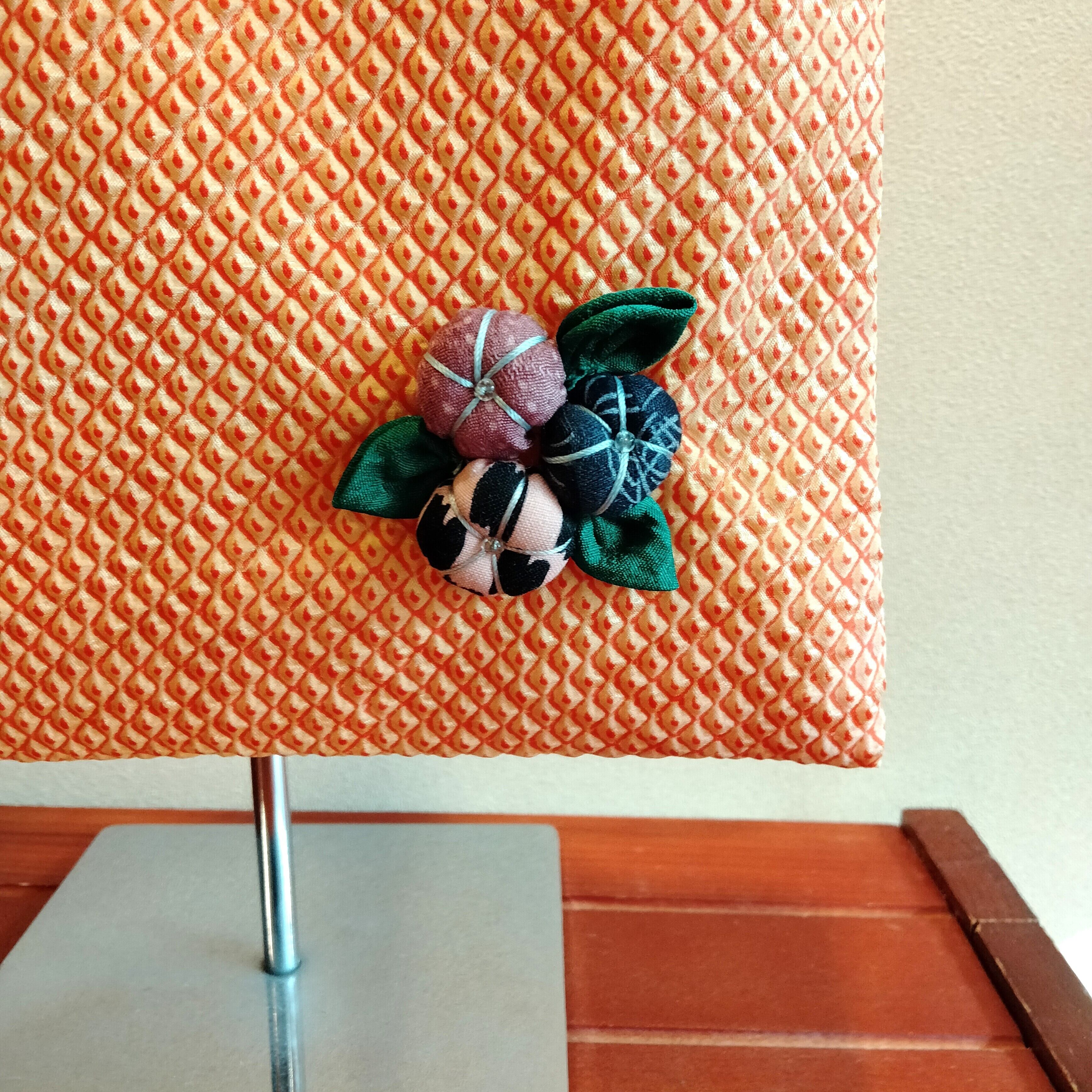 着物生地で作った梅のモチーフを手縫いで付けました。